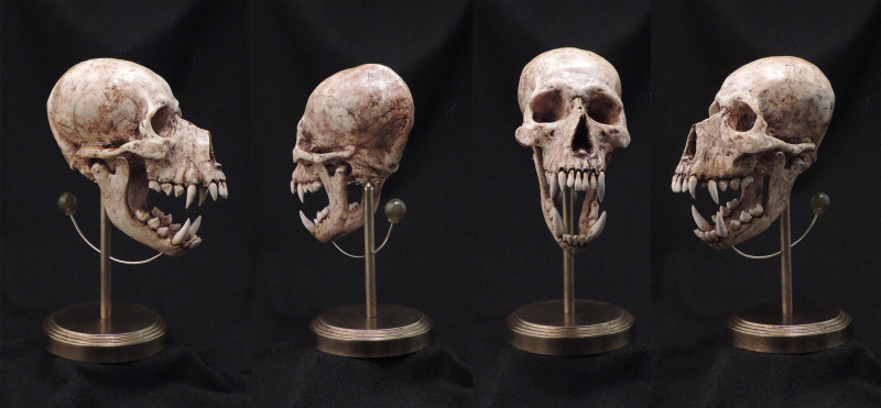 Richard Upton Pickman, a controversial Boston Artist, vanished from his North End studio in 1926. Before the demolishing of the Foster Court tenement, the landlord, who wished to remain anonymous, gathered the artist’s effects and held them until he could broker an estate sale. Many curiosity seekers came to the sale to see what remained of the Ghoulish painters workshop. There were many canvases, brushes, pigments and unfinished works, as well as a camera, tripod, draperies and dried flowers. It seemed that the patrons were to be disappointed by all the mundane trappings of an artist’s studio until the last object was brought out. It was a mounted skull, an anatomical study used by artist around the world, except this one was different. Its anatomy was bizarre, as if a human and jackal had been mixed with a nightmare. The shock and malevolence of the piece was so strong that instead of purchasing the jewel of the sale, the patrons left, shaken and sickened. It stayed with the landlord for years. He would complain of strange scratching sounds in his basement, and the feeling of being watched when he walked home at night. In the end The Rumtucket Trading Company purchased it, and is willing to sell it…To you.