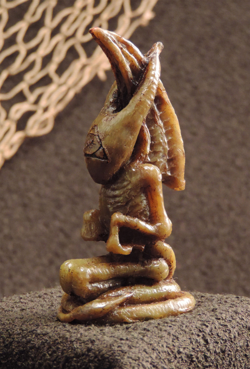 These items surfaced in Kerman, Iran, during the excavation of a temple-like structure from the 3rd Century. Items and inscriptions found led archaeologists to hypothesize that the temple had been used by an Esoteric Dream Cult. Traces of mind altering mixtures and incense, coupled with strange tablets describing dream travel and fantastic heavenly beings support this. The varied, but eerily similar carved statuettes from an unknown material were said to be gifts from a god, YibbTstll, and were meant to act as the worshiper’s servant in the “Dreamlands”. Though rare, these effigies have turned up in private collections as well as museums.