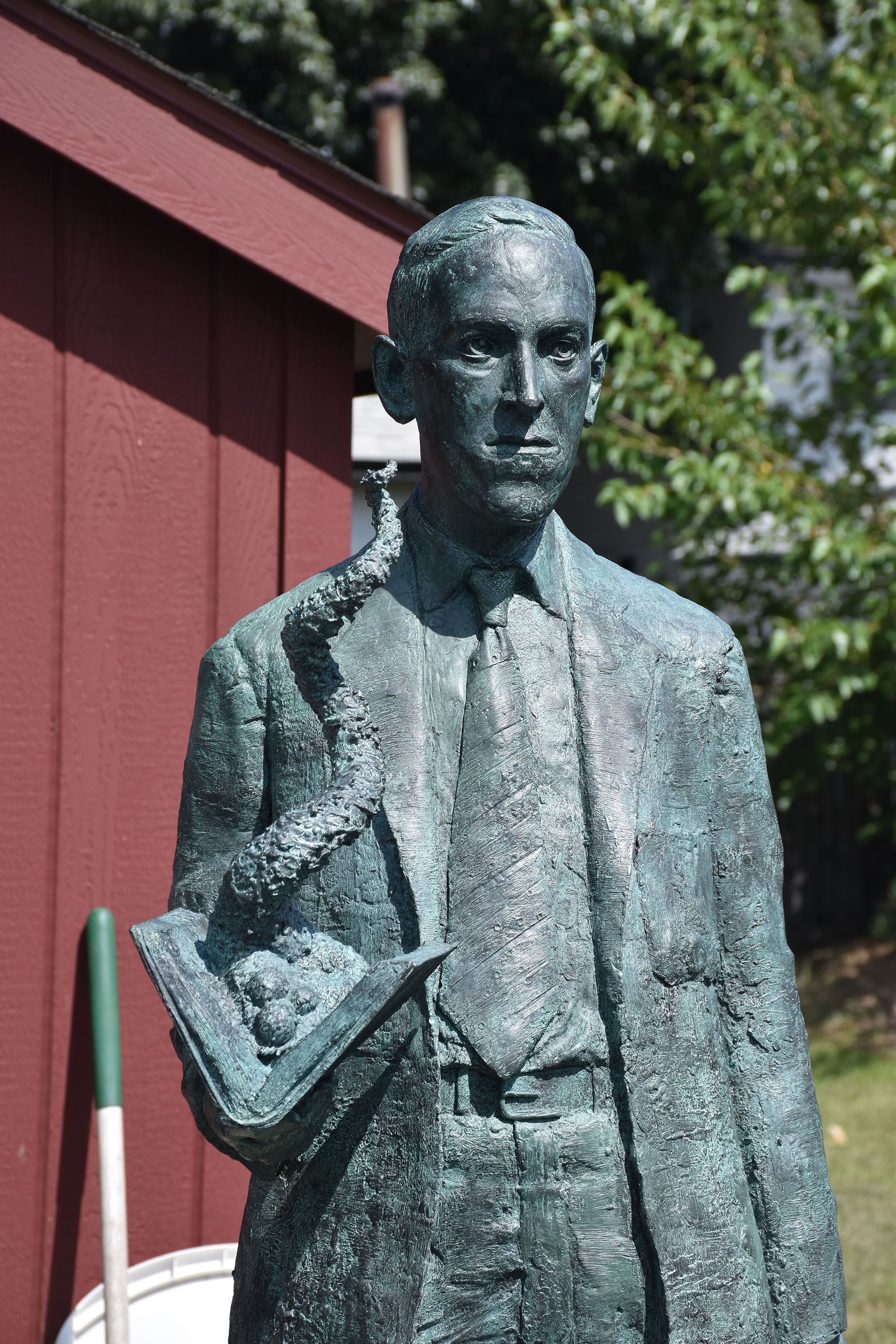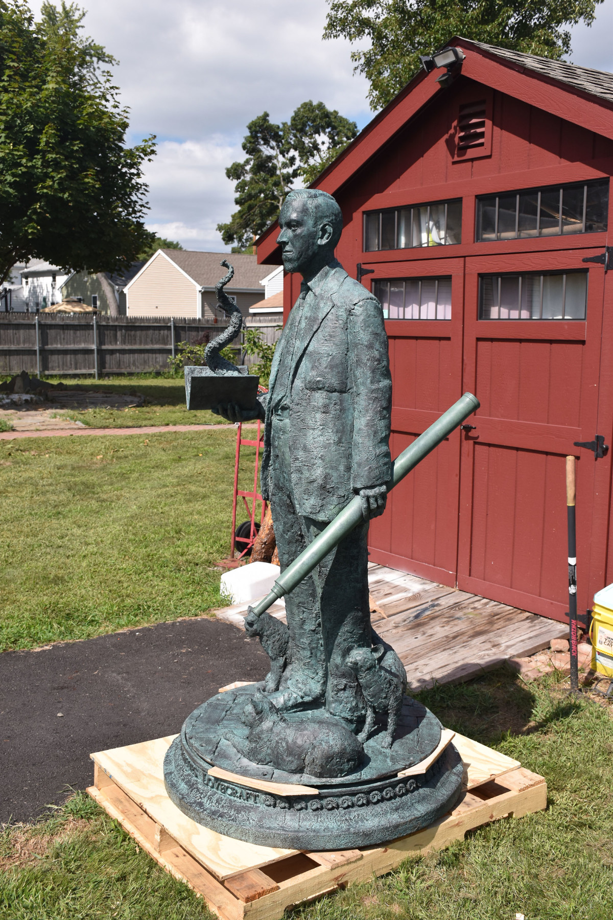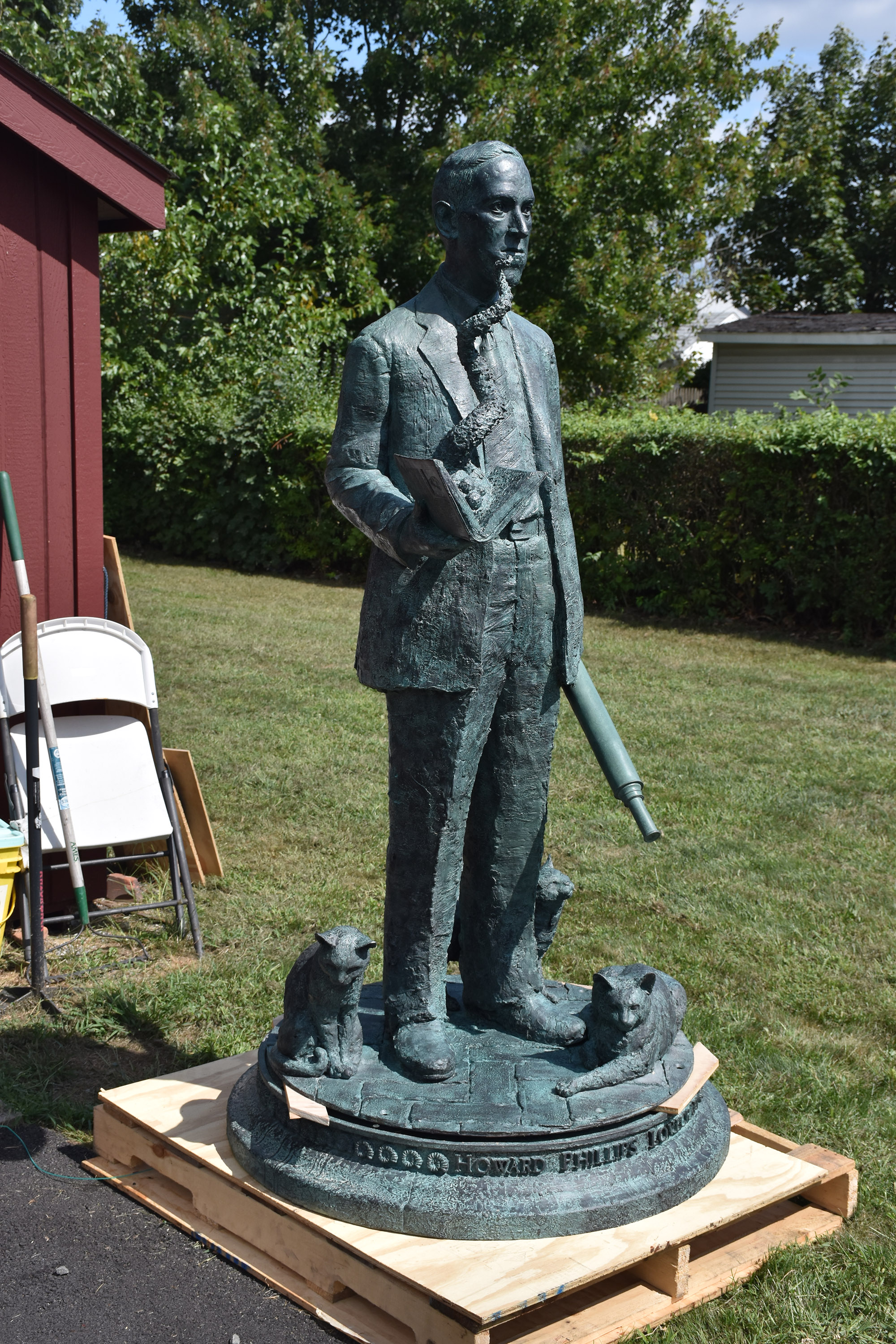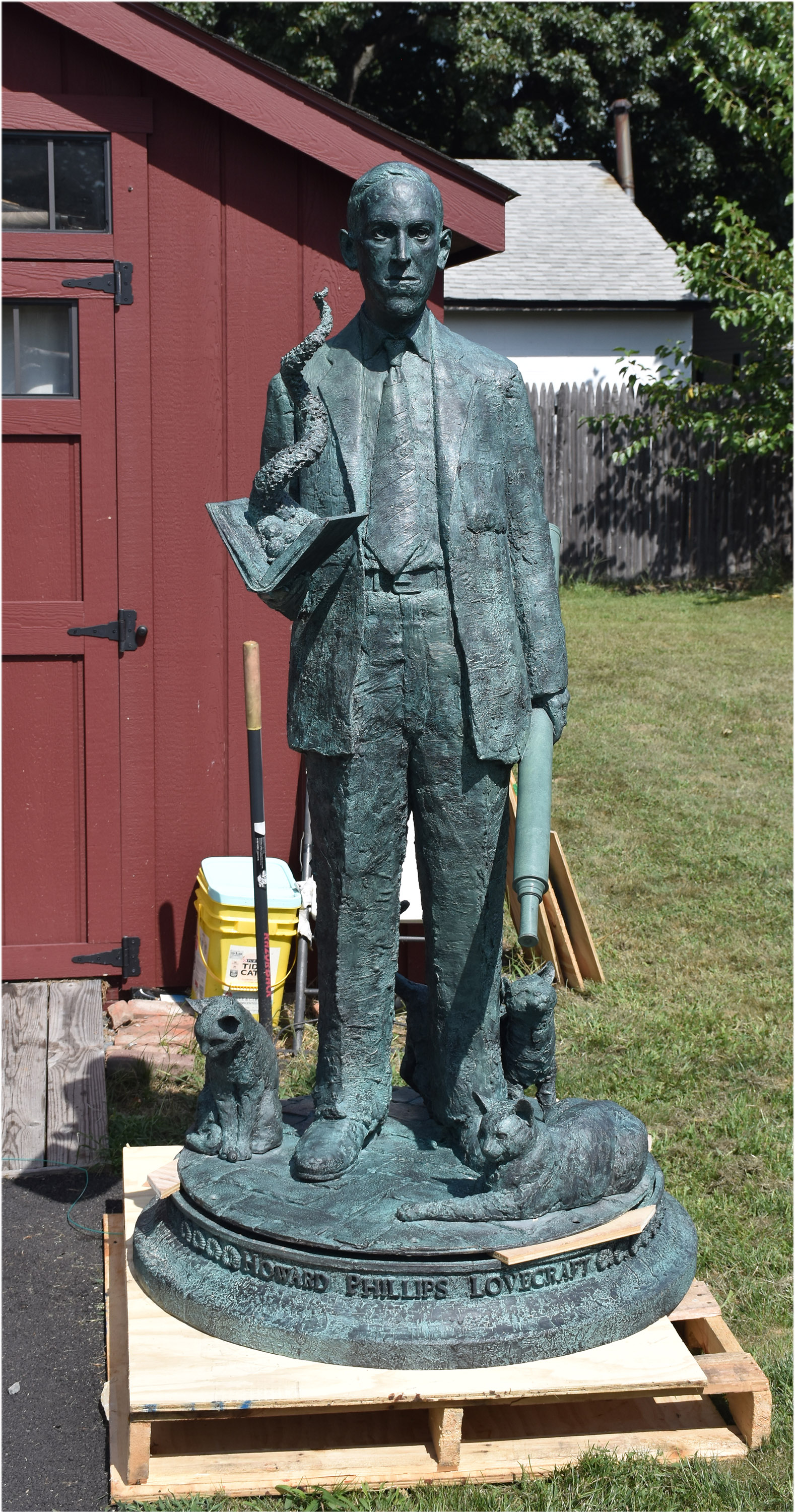 The finished bronze statue of H. P Lovecraft, delivered, awaiting placement.