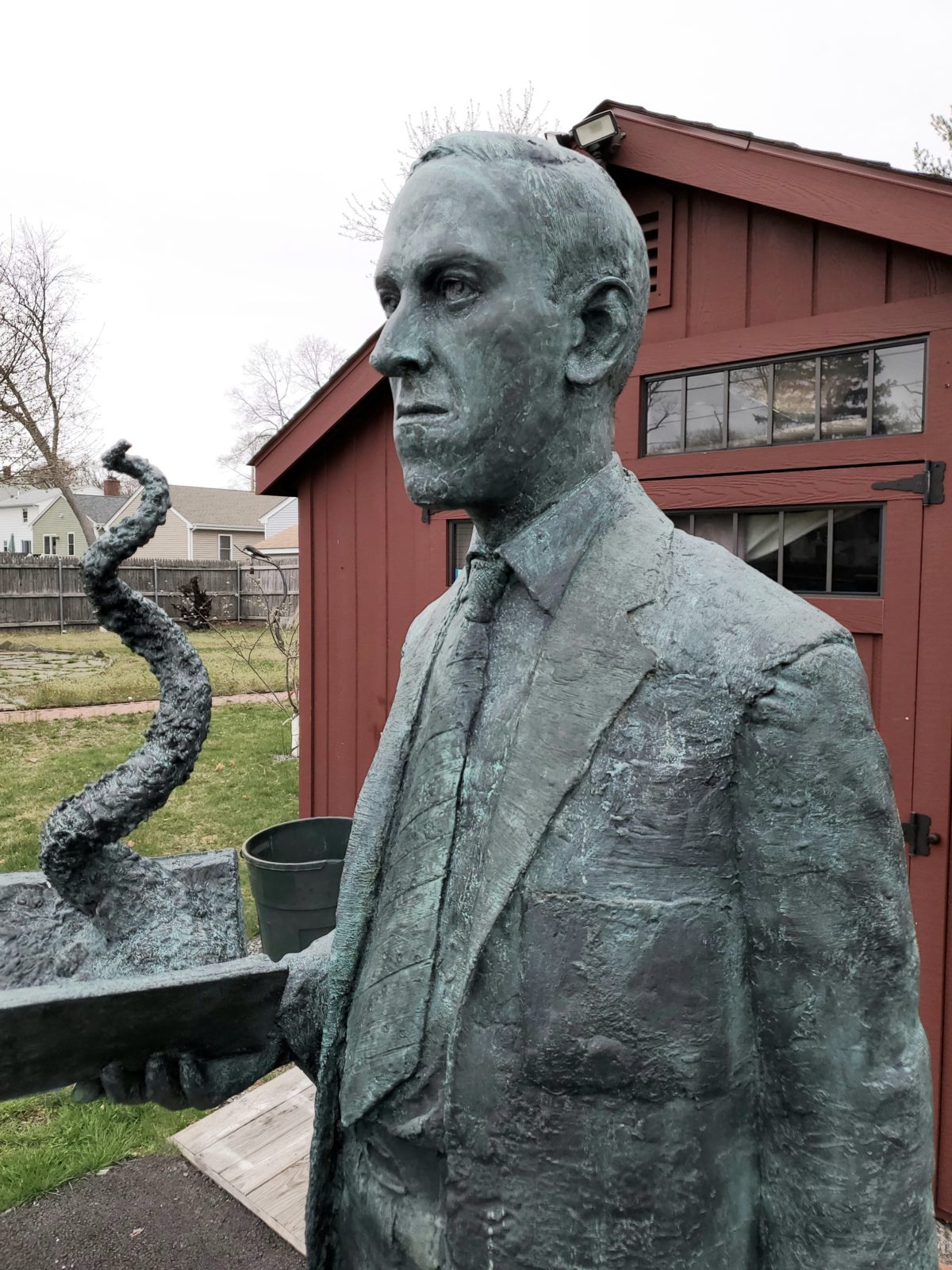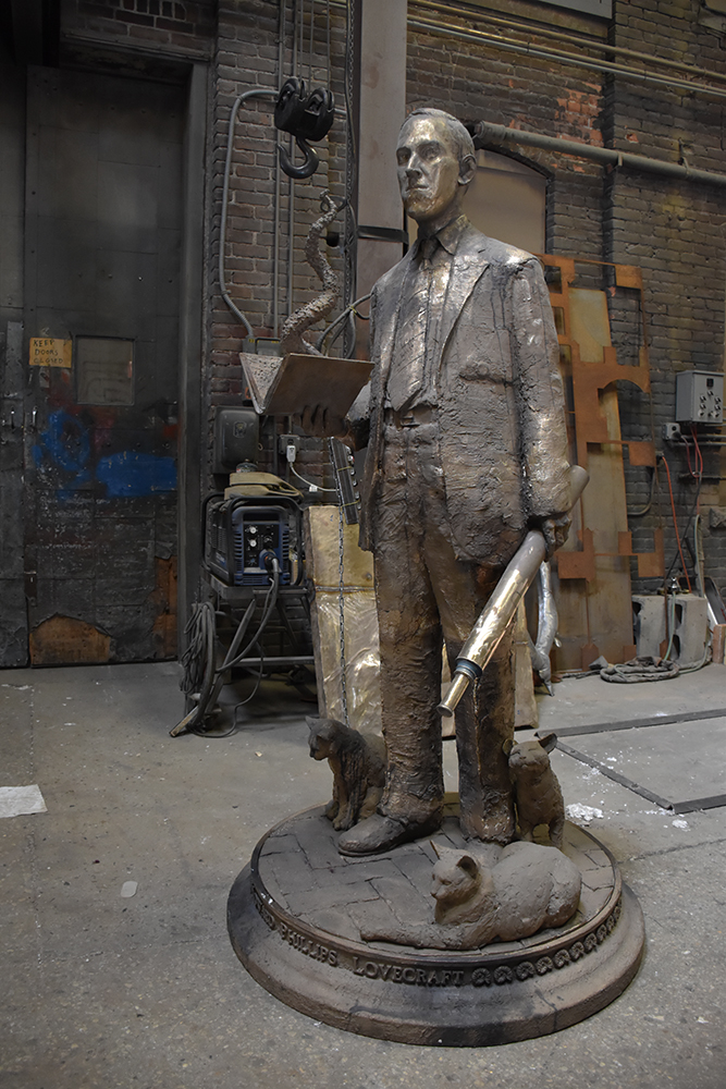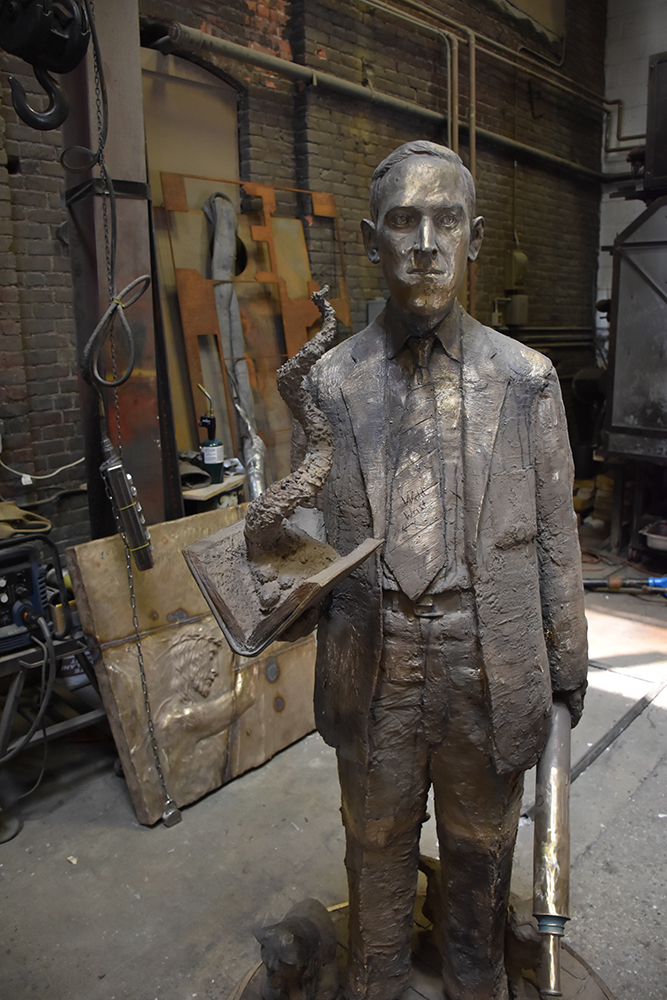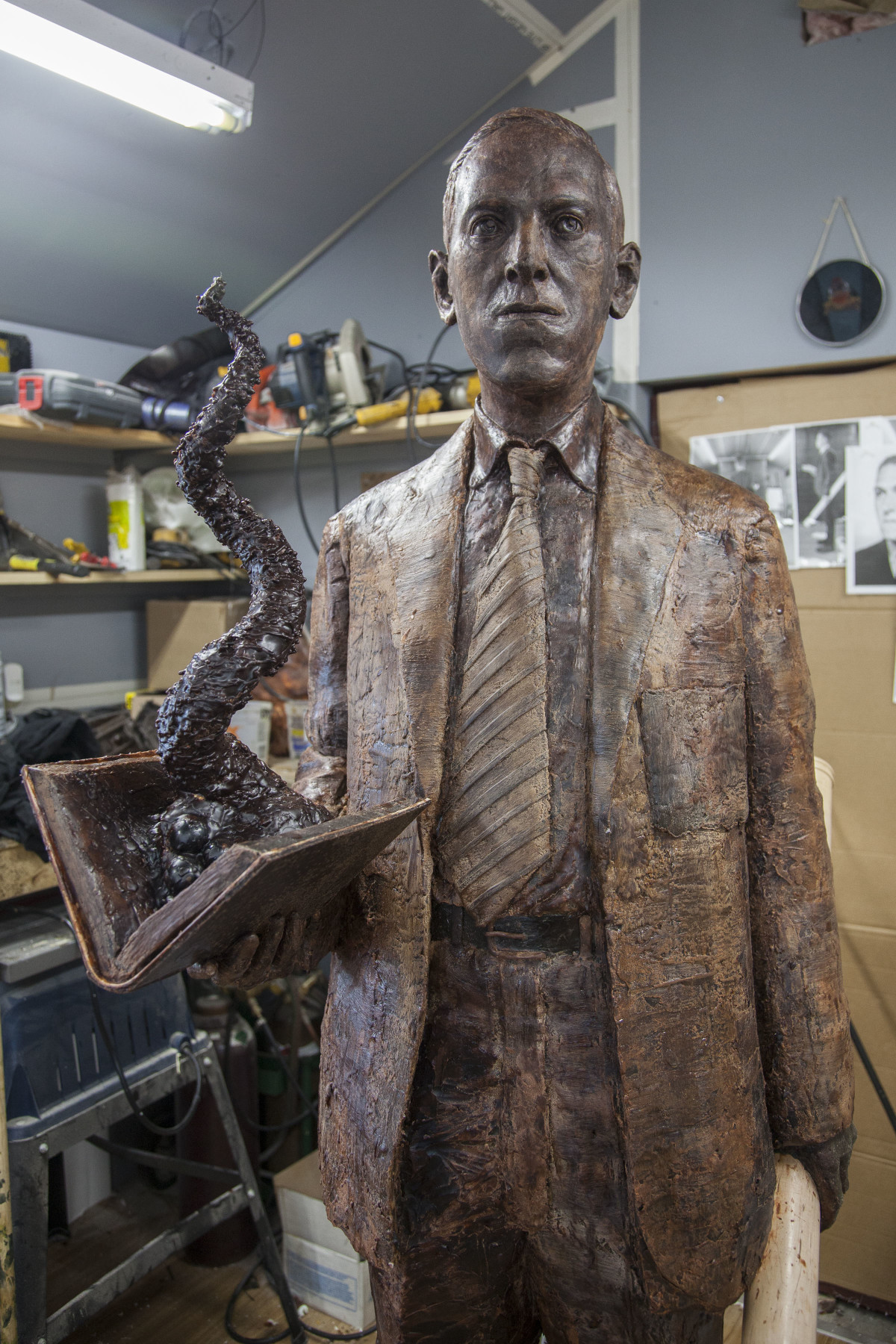 The finished bronze statue of H. P Lovecraft, delivered, awaiting placement.